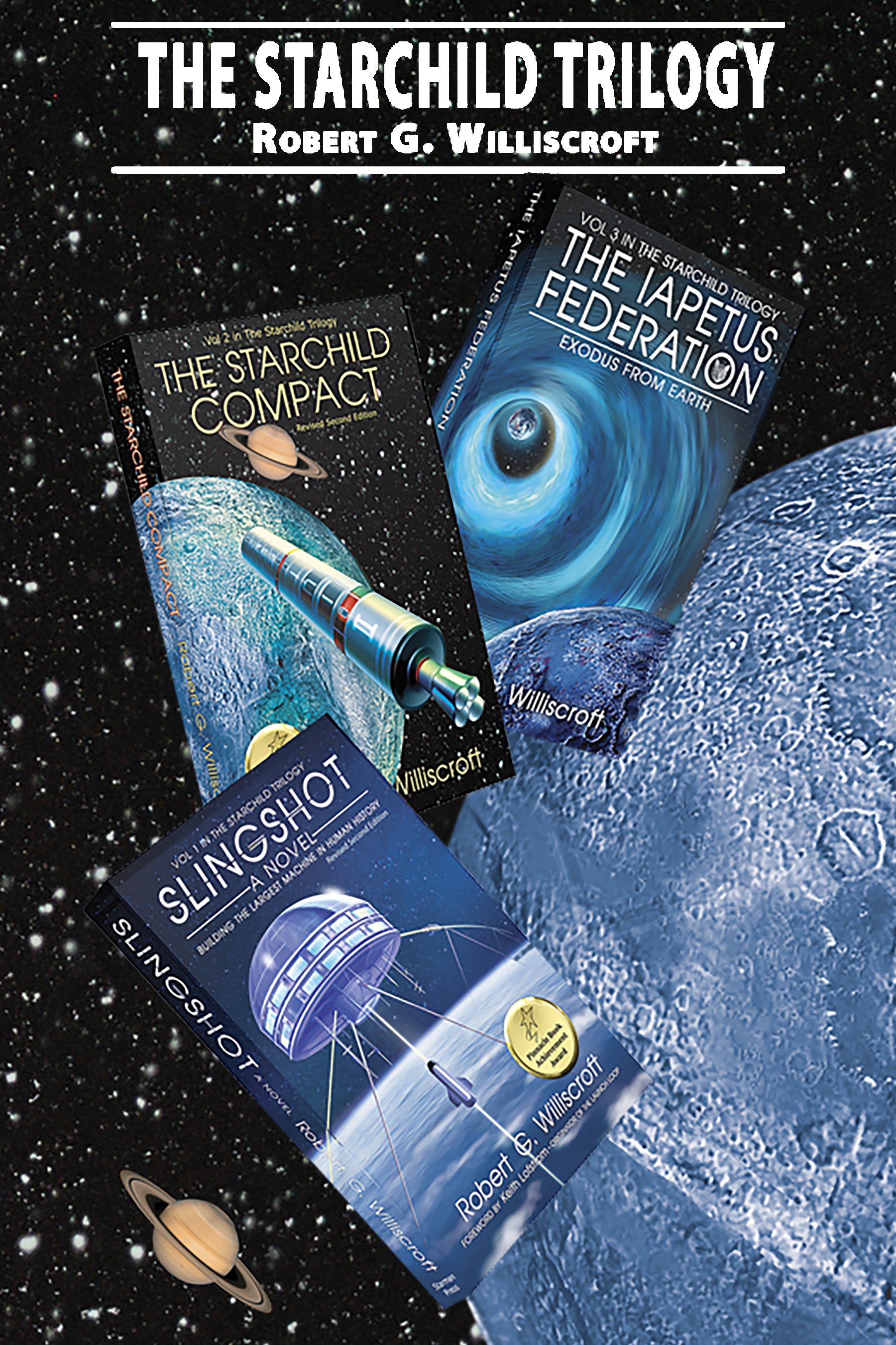 The Starchild Trilogy, by Robert G. Williscroft(Sci-Fi, Contemporary) The Starchild Trilogy begins with building a Space Launch Loop enabling massive movement off Earth and subsequent settlement of Cislunar-Space, Mars, and beyond. Slingshot is the story of the struggle behind constructing the largest machine ever built stretching between Baker and Jarvis Islands in the Equatorial Pacific, and how the men and women behind Slingshot overcome the project's physical, economic, and human obstacles. In The Starchild Compact, a team exploring Saturn's moon Iapetus discovers it to be a derelict starship, and meets the Founders, remnants of an ancient, advanced race, the Ectarians, that arrived in the Solar System 150,000 years ago. Together, they create the Starchild Institute governed by a document they call the Starchild Compact to further develop and introduce Ectarian technology to the Solar System. Using Ectarian technology, they develop near lightspeed spacecraft, artificial wormholes, FTL starships, and human longevity. As human colonies expand into the Solar System, they form a governing coalition: The Iapetus Federation. While a united Islam pursues a global Jihad that rages across the planet putting millions to the sword, the Federation enables an exodus from Earth using artificial wormholes. From hand-to-hand combat in the oceans, to battles on Earth's surface, to the challenge of living off-Earth and reaching for the stars, our heroes fight to survive and to expand humankind to the far reaches of the universe. Available now from Amazon / Audible and iTunes